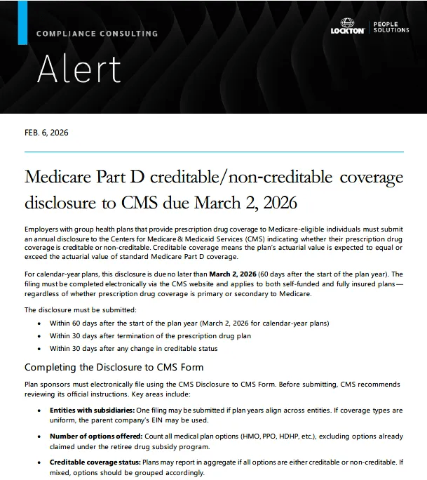Not legal advice: Nothing in this alert should be construed as legal advice. Lockton may not be considered your legal counsel, and communications with Lockton's Compliance Consulting group are not privileged under the attorney-client privilege.