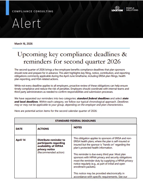 Not legal advice: Nothing in this alert should be construed as legal advice. Lockton may not be considered your legal counsel, and communications with Lockton's Compliance Consulting group are not privileged under the attorney-client privilege.