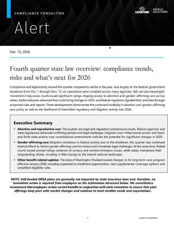 Abortion and reproductive care: This quarter saw legal and regulatory turbulence as courts, federal agencies and state legislatures advanced conflicting policies and legal challenges. Litigation over mifepristone access and back-and-forth state actions over constitutional amendments indicate the potential for significant changes in 2026. Gender-affirming care: Despite a slowdown in federal activity due to the shutdown, this quarter saw continued federal efforts to restrict gender-affirming care for minors and immediate legal challenges. At the same time, federal courts issued pivotal rulings centered on privacy and nondiscrimination issues, while states maintained their longstanding divide, resulting in little change to the overall national landscape. Other benefit-related updates: The state of Washington finalized several changes to its long-term care program effective January 2026, including expanded re-enrollment opportunities, new supplemental coverage options and simplified eligibility rules. |